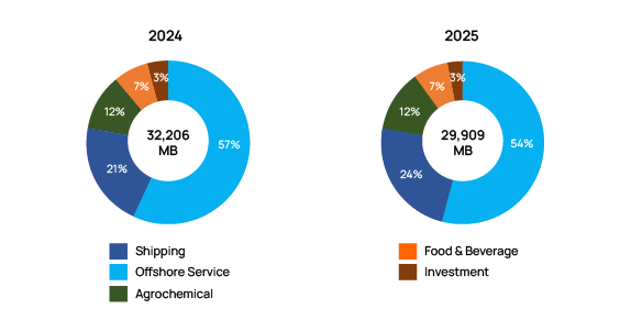 Answer : Approximately 90% of total revenues came from Shipping, Offshore Service, and Agrochemical Segments. In 2025, total revenues were recorded at Baht 29,909 million. Shipping, Offshore Service, Agrochemical, Food & Beverage, and Investment contributed 24%, 54%, 12%, 7%, and 3% to the consolidated revenues, respectively.