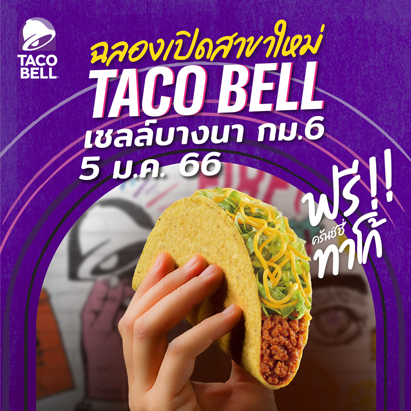 - Free Crunchy Taco at New Branch ! : To celebrate the new branch opening at Shell service station Bangna Km.6, customers who have seen the promotional campaign from the street cut-out or TACO BELL social media and add Line Official Taco Bell TH have a chance to get a 69 Baht Crunchy Taco for FREE at TACO BELL Shell Bangna Km.6 from 5 to 14 January 2023. Only 100 pieces / day available.
