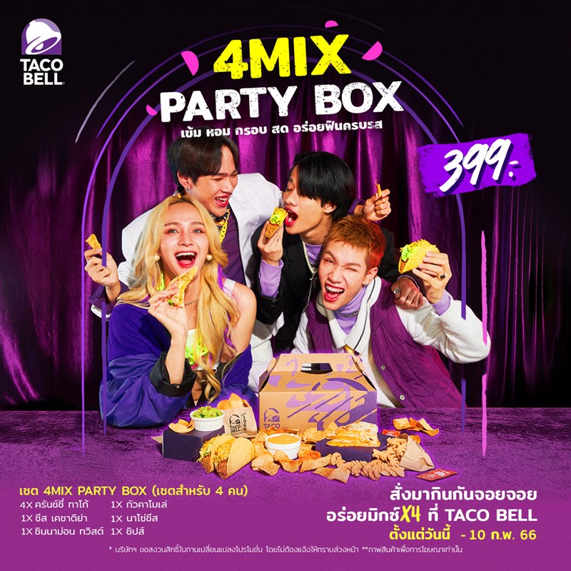 - A Special Offer for “4MIX Party Box”: TACO BELL and 4MIX Thai Boyband: Ninja- Jarukit Khamhongsa, Mcka- Natphatra Diloettrakun, Folksong- Chaninthorn Boonrod, and George- Ramet Kiantisukudom, from 411 Records in collaboration to create the “4MIX Party Box”, a delicious Mexican-style set menu filled with a 4 Crunchy Taco, 1 Cheese Quesadilla, 1 Guacamole, 1 Nacho Cheese, 1 Cinnamon Twist, and 1 Chip for only 399 Baht. Taco Bell’s 4 MIX Party BOX is ready to serve customers from 6 January to 10 February 2023.