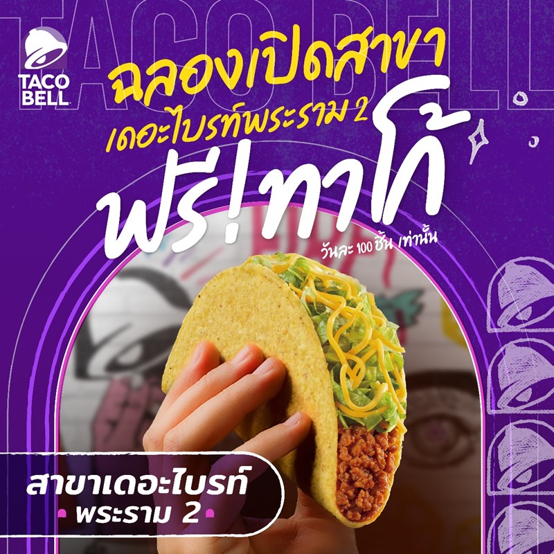 To celebrate the new branch opening at The Bright, customers who have seen the promotional campaign from the street cut-out or TACO BELL social media and add Line Official Taco Bell TH have a chance to get a 69 Baht Crunchy Taco for FREE at TACO BELL The Bright restaurant from 2 to 12 February 2023. Only 100 pieces / day available.