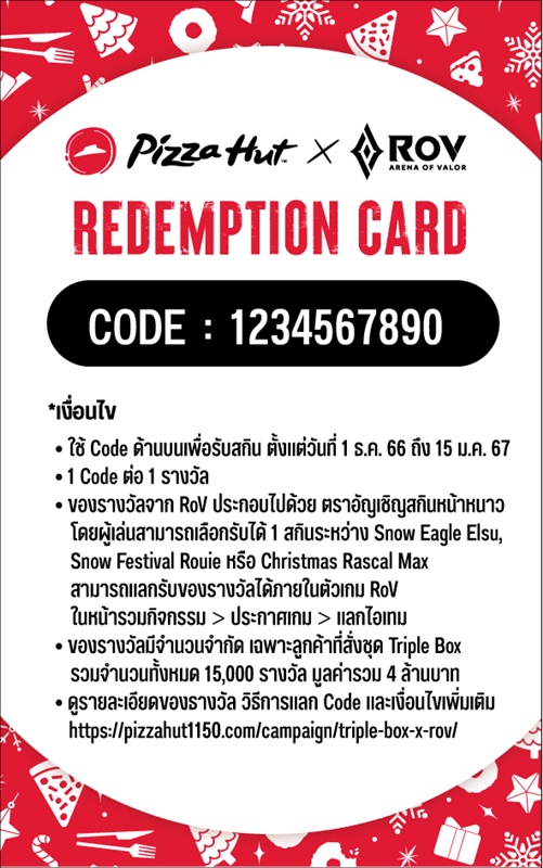 Upon purchasing the exclusive "Triple Box x ROV" special set, customers will be entitled to receive a redemption card for a complimentary ROV skin prize. Choose from the options of Snow Eagle Elsu, Snow Festival Rouie, or Christmas Rascal Max from ROV. There are over 15,000 prizes available, collectively valued at 4 million baht.