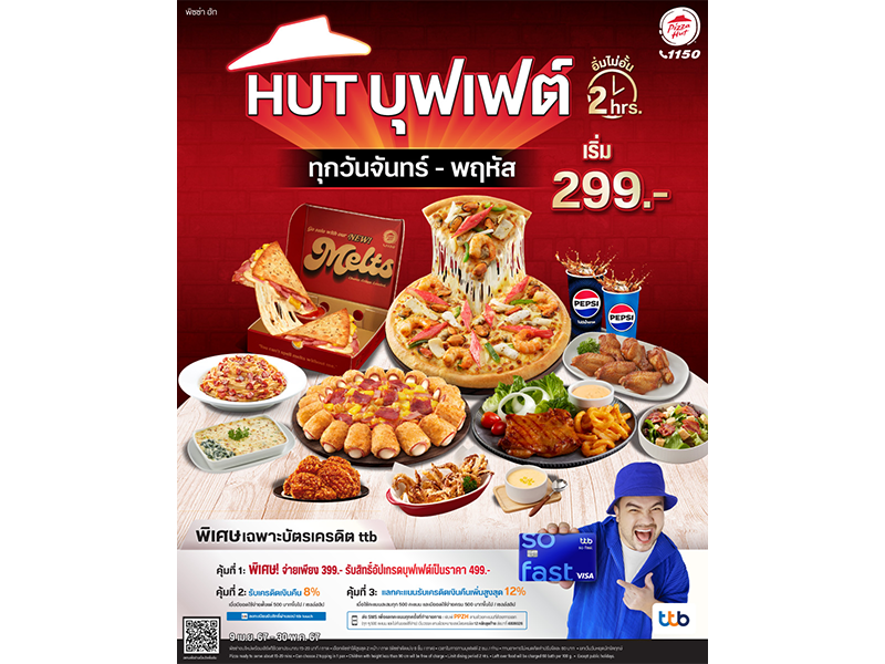 กรุงเทพมหานคร, 9 เมษายน 2567 – พิซซ่า ฮัท 1150 แบรนด์พิซซ่าระดับโลกภายใต้การบริหารงานของบริษัท พีเอช แคปปิตอล จำกัด เอาใจคอบุฟเฟต์อีกครั้ง กับ “HUT บุฟเฟต์” โดยนำเสนอบุฟเฟต์ 3 ระดับ Hut Buffet 299.- อิ่มอร่อยถึงใจกับพิซซ่า 22 หน้าในหมวดสุดฮิต ขอบหนานุ่มและบางกรอบ ในราคาเริ่มต้น 299 บาท, Hut Buffet 399.- อิ่มอร่อยสุดฟิน กับพิซซ่า 4 หมวดสุดฮิต สปาเก็ตตี้ เมนูทานเล่น ผักโขมอบชีส และสลัด ในราคา 399 บาท และ Hut Buffet Premium 499.- อิ่มแบบไม่อั้น ที่สุดของความคุ้มค่า ในราคา 499 บาท กับเมนูที่เลือกมาเป็นพิเศษ ทั้งพิซซ่าหน้าใหม่ อย่าง แซลมอนครีมชีส, แซลมอนแซ่บ, ดีทรอยต์พิซซ่า, แกรนเด, ชีส 9 ยอด พร้อมจัดเต็มกับสุดพรีเมียมกว่า 60 เมนู อย่าง สปาเก็ตตี้, สเต๊ก, ซุป, สลัด และเมนูสุดฮิตอย่าง เมลทส์, ไก่นิวออร์ลีนส์ เต็มอิ่มอร่อยจากเดิม 1 ชั่วโมงครึ่ง เป็น 2 ชั่วโมง/รอบ/คน ฟรีน้ำรีฟีล ทุกวันจันทร์ - พฤหัสบดี ตั้งแต่วันที่ 9 เมษายน – 30 พฤษภาคม 2567 (ยกเว้นวันหยุดนักขัตฤกษ์) สิทธิพิเศษ สำหรับสมาชิกบัตรเครดิต TTB สามารถอัพเกรดโปรบุฟเฟต์จาก 399 เป็น 499 บาทได้