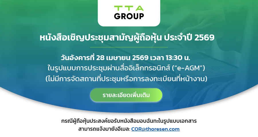 ยินดีต้อนรับเข้าสู่มุมนักลงทุนสัมพันธ์ของโทรีเซนไทย คุณจะพบข้อมูลทั้งหมดเกี่ยวกับข้อมูลสำคัญของบริษัท ส่วนแบ่ง กลยุทธ์ และเหตุการณ์ทางการเงินได้ที่นี่
