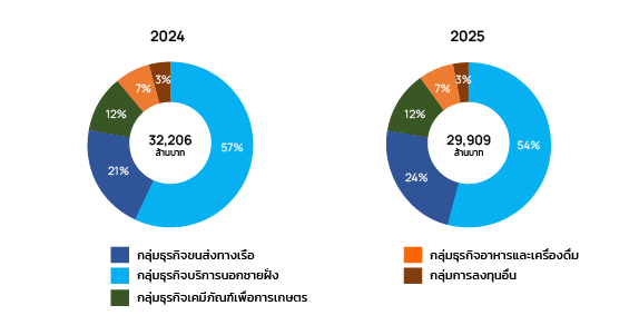 ตอบ : รายได้ประมาณร้อยละ 90 ของรายได้รวมมาจากกลุ่มธุรกิจขนส่งทางเรือ กลุ่มธุรกิจบริการนอกชายฝั่ง และกลุ่มธุรกิจเคมีภัณฑ์เพื่อการเกษตร ทั้งนี้ รายได้รวมใน 2568 อยู่ที่ 29,909 ล้านบาท โดยกลุ่มธุรกิจขนส่งทางเรือ กลุ่มธุรกิจบริการนอกชายฝั่ง กลุ่มธุรกิจเคมีภัณฑ์เพื่อการเกษตร กลุ่มอาหารและเครื่องดื่ม และกลุ่มการลงทุนอื่น คิดเป็นร้อยละ 24 ร้อยละ 54 ร้อยละ 12 ร้อยละ 7 และร้อยละ 3 ของรายได้รวมทั้งหมด ตามลำดับ