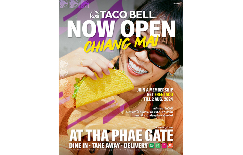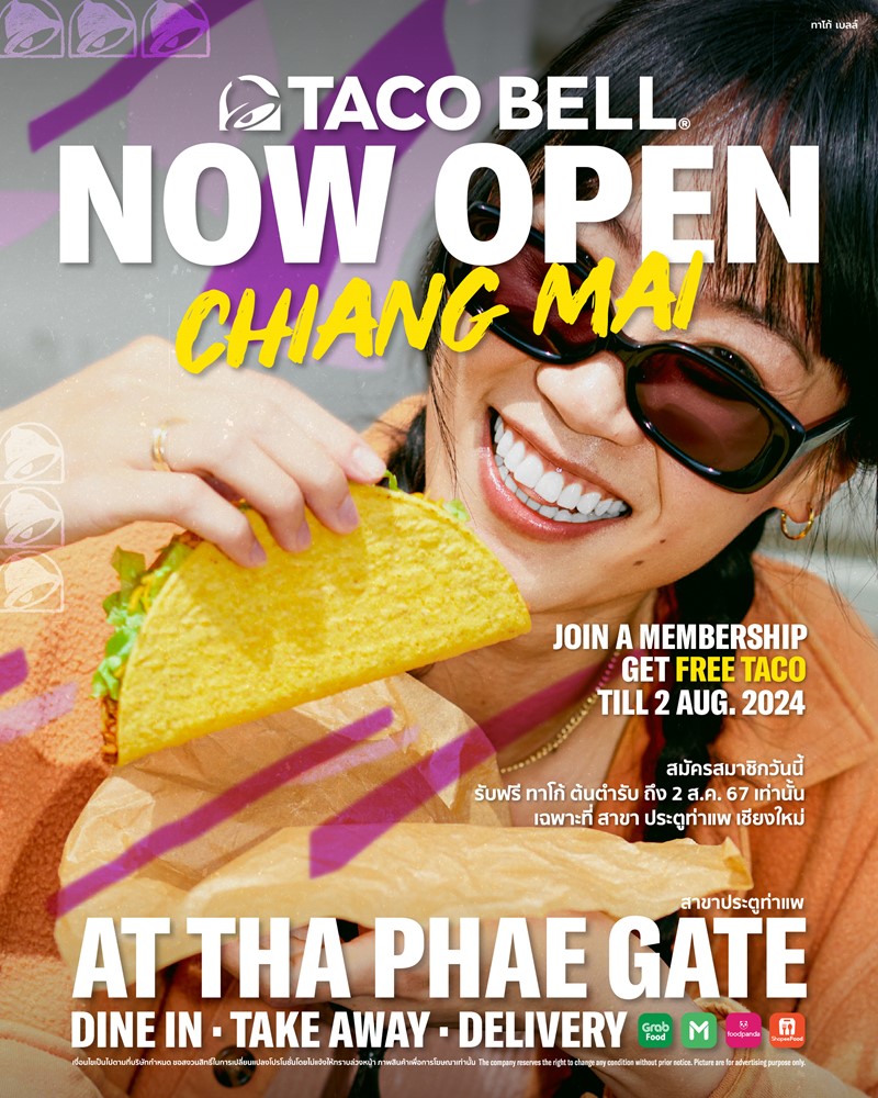เชียงใหม่ ประเทศไทย – 2 สิงหาคม 2567 : บริษัท สยาม ทาโก้ จำกัด ซึ่งเป็นผู้บริหารแฟรนไชส์ ทาโก้ เบลล์ (Taco Bell) ร้านอาหารสไตล์กึ่งเม็กซิกันที่มีชื่อเสียงจากสหรัฐอเมริกา ได้ฤกษ์เปิดสาขาแรกในภาคเหนือที่ ประตูท่าแพ จ.เชียงใหม่ พร้อมจัดโปรโมชันพิเศษสุด เพื่อเปิดโอกาสให้นักท่องเที่ยวชาวไทยและชาวต่างชาติ ได้ลิ้มลองเมนูทาโก้ต้นตำรับจากอเมริกา ด้วยกติกาง่ายๆ เพียงลูกค้าสมัครสมาชิก ผ่าน Line Official Account : @Tacobellthai รับฟรี Crunchy Taco (จำกัด 100 สิทธิ์ / วัน) ถึงวันที่ 2 สิงหาคม 2567 และเมื่อสั่งอาหารครบ 350 บาทขึ้้นไป พร้อมกับเช็คอินที่ Facebook Taco Bell Thailand รับฟรี Loaded Nacho เริ่มตั้งแต่วันนี้ ถึง 15 สิงหาคม 2567
